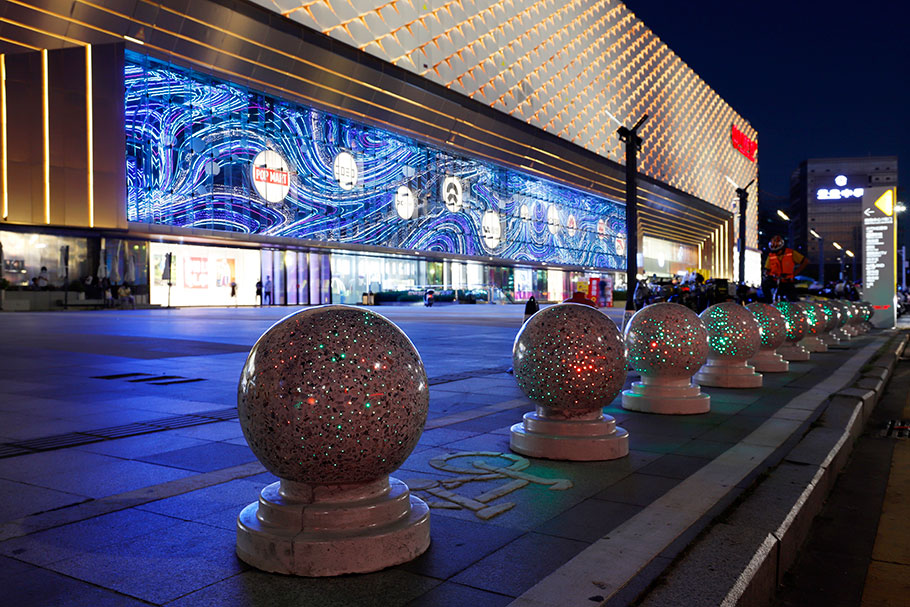 新型路障石材具有擋車功能,提升場所的形象和安全性,夜晚展現(xiàn)出特別絢麗的效果